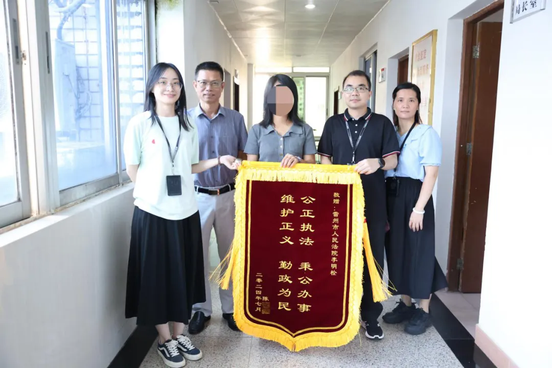 “还没立案就帮我把钱拿回来了,雷州法院执前调解真是高效”。6月28日下午,申请执行人陈某珠来到雷州法院,向执行法官送上一面写有“公正执法、秉公办事、维护正义、勤政为民”的锦旗,感谢执行法官尽职尽责、公正高效执行。